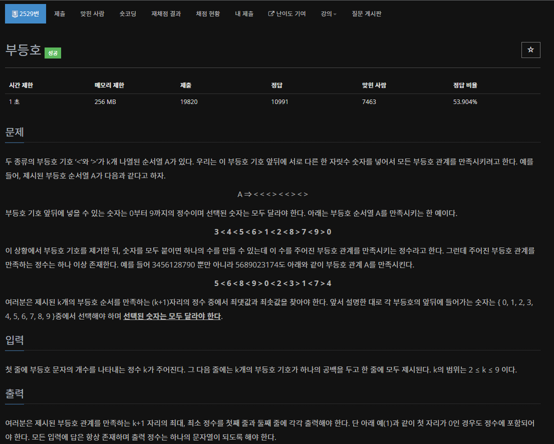 두 종류의 부등호 기호 ‘<’와 ‘>’가 k개 나열된 순서열 A가 있다. 우리는 이 부등호 기호 앞뒤에 서로 다른 한 자릿수 숫자를 넣어서 모든 부등호 관계를 만족시키려고 한다. 예를 들어, 제시