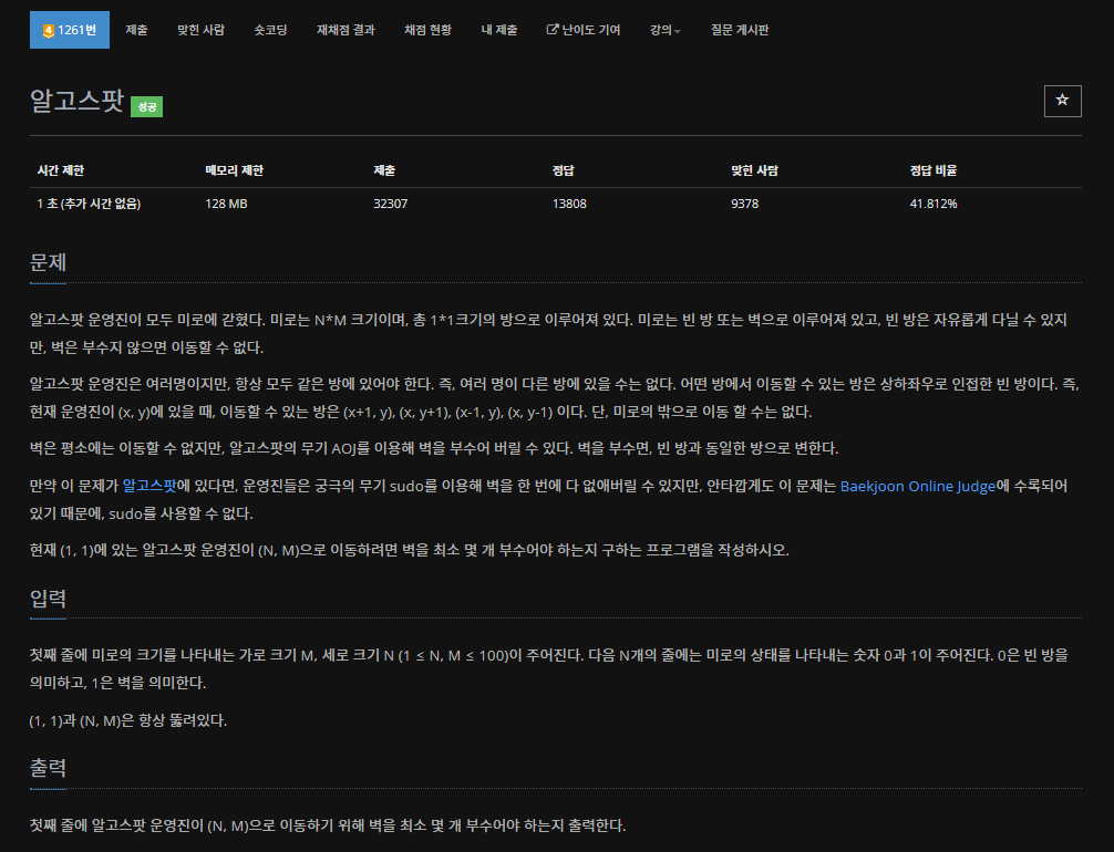 - 벽을 부시면 비용(cost)를 추가 지불 해야하므로 deque()오른쪽에 넣는다.