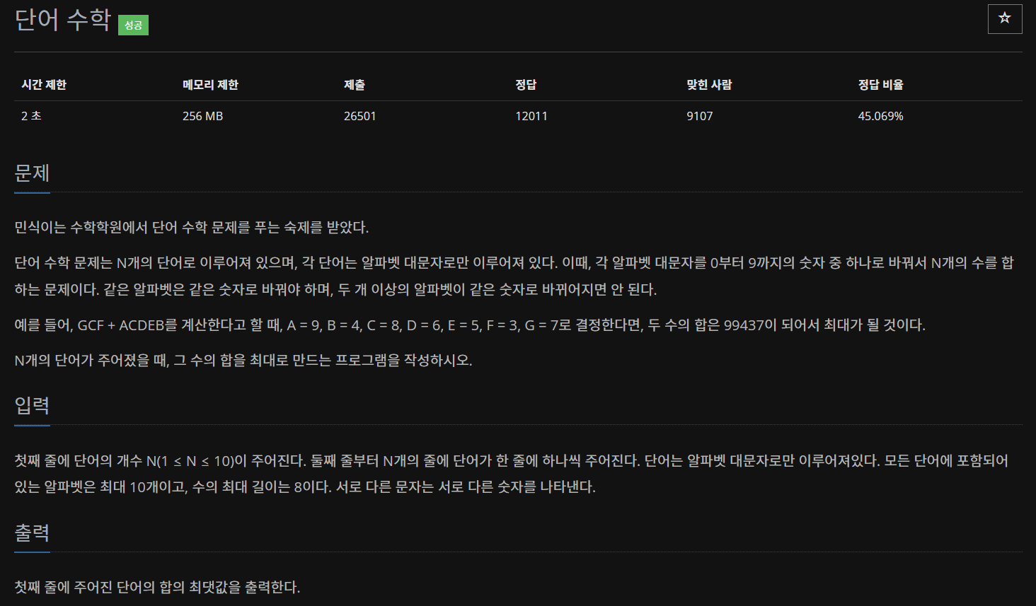 첫째 줄에 단어의 개수 N(1 ≤ N ≤ 10)이 주어진다. 둘째 줄부터 N개의 줄에 단어가 한 줄에 하나씩 주어진다. 단어는 알파벳 대문자로만 이루어져있다. 모든 단어에 포함되어 있는 알파벳은 최대