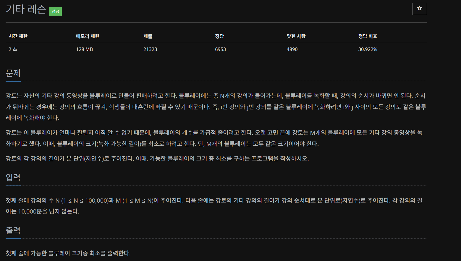따라서 메모리 크기의 최소지점과 최대지점 투 포인터를 집아 이분 탐색을 해서 블루레이 크기중 최소를 출력하도록 한다.