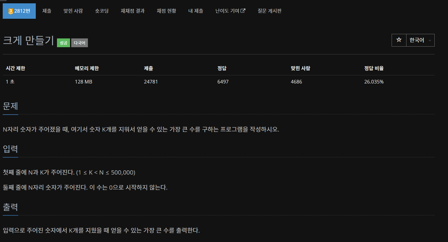 N자리 숫자가 주어졌을 때, 여기서 숫자 K개를 지워서 얻을 수 있는 가장 큰 수를 구하는 프로그램을 작성하시오.