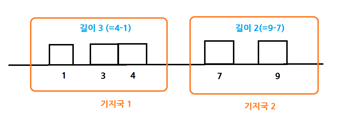 그려면 너무 간단하게 이웃과 거리 n-1개 중 길이가 긴 k-1개를 집중국과 다른 집중국과의 거리로 생각하여 전체 길이에서 빼주면 된다.(위에 그림에서는 4와 7사이 거리가 3으로 가장 길기 때문에 집중국과의 거리로 생각하고 수신 가능한 거리에서 제외 시켰다.