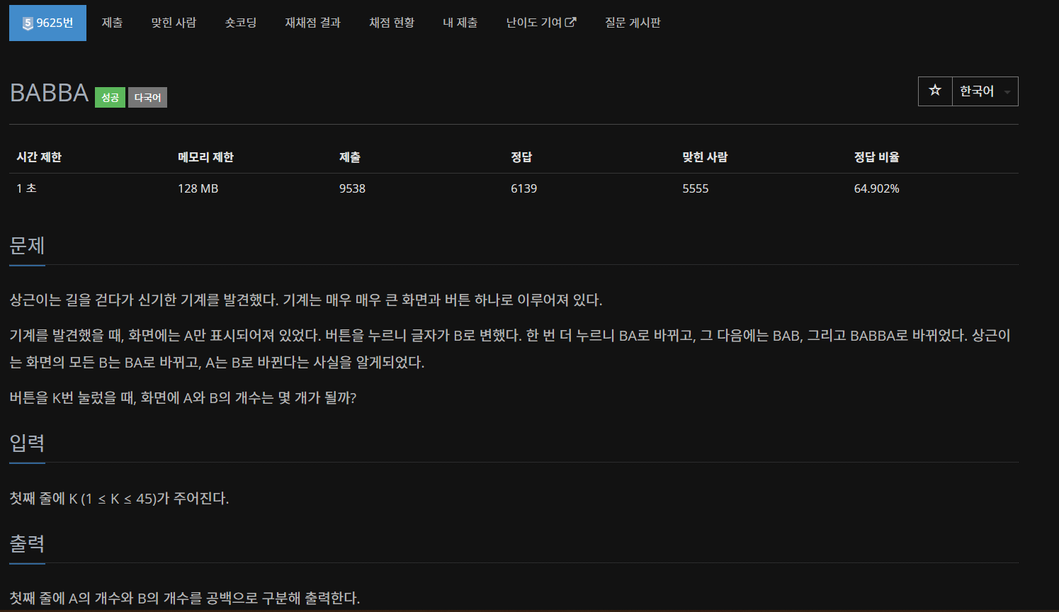 - A→B, B→BA로 바뀌고 k번째 바뀌었을 때 A, B의 개수를 구하는 것이므로 DP를 이용하는 것이 편할 것이란 생각이 든다.