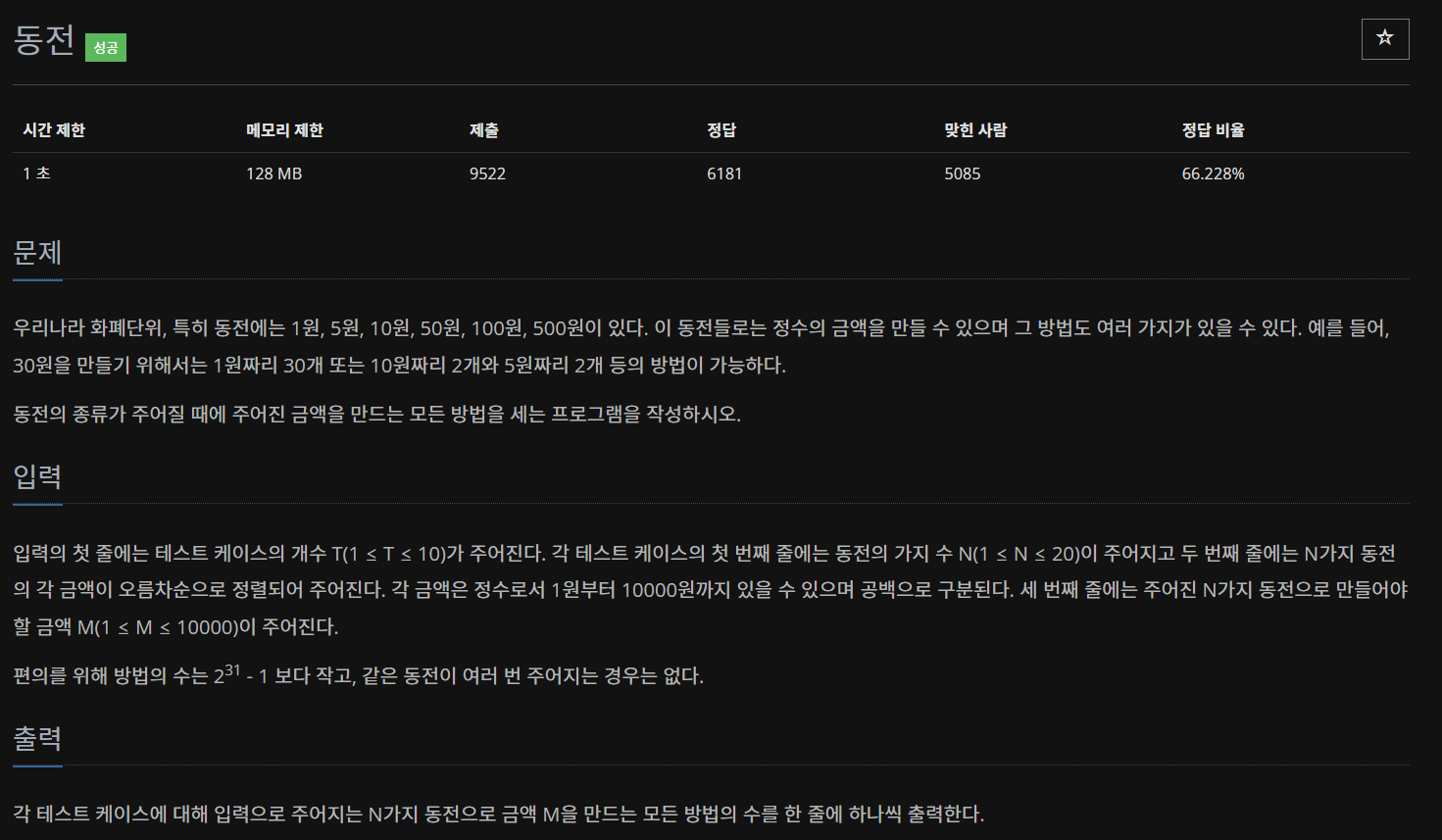 - 동전이 있는것은 1개로 되므로 dp[coin]은 1이상이다.