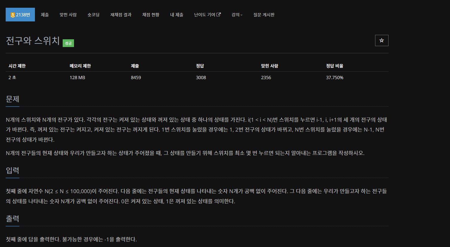 N개의 스위치와 N개의 전구가 있다. 각각의 전구는 켜져 있는 상태와 꺼져 있는 상태 중 하나의 상태를 가진다. i(1 < i < N)번 스위치를 누르면 i-1, i, i+1의 세 개의 전구의 상태가 바뀐다. 즉, 꺼져