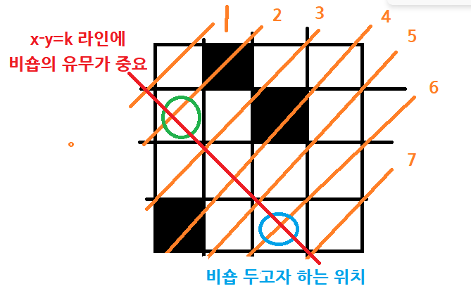 - 우상향 대각선을 두고 자리를 위치시켜가며 배열 시킬 때 우하향 대각선 어디에 비숍이 있는지는 중요하지 않다. 다만 있는지 없는지가 중요하다.