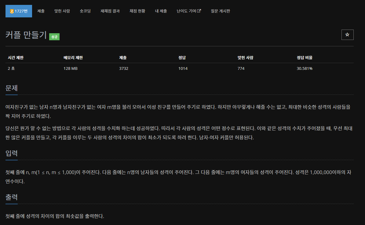 - sort를 통해 성격을 수치화한 것을 오름차순으로 만든 다음 남자 0번과 가장 맞는 여자 j(0<=j<=m-n)번을 찾은 다음 1번은 여자 j+1번부터 찾고 하면서 최적의 해를 찾으면 된다.