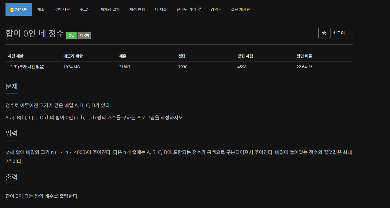 https://www.acmicpc.net/problem/7453