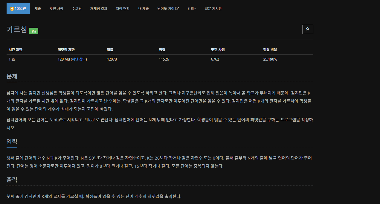 첫째 줄에 단어의 개수 N과 K가 주어진다. N은 50보다 작거나 같은 자연수이고, K는 26보다 작거나 같은 자연수 또는 0이다. 둘째 줄부터 N개의 줄에 남극 언어의 단어가 주어진다. 단어는 영어 소문