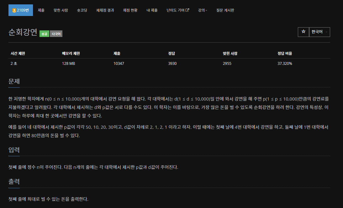 - 그러면 촉박한 d를 가진 것도 많이 할 수 있기 때문에 큰 값을 주는 순서대로 마감일자부터 가까운 날까지 확인하면서 계획이 없는 날에 강연을 하기로 하고 코드를 짜면 끝!