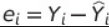 위의 식으로 예측된 값들은 Y의 실제 관측된 값들과 일치할 수 없는데 이 두 값의 차이를 잔차(residual)라 부르고 ei로 표시한다. 즉 잔차는 다음과 같이 정의된다.