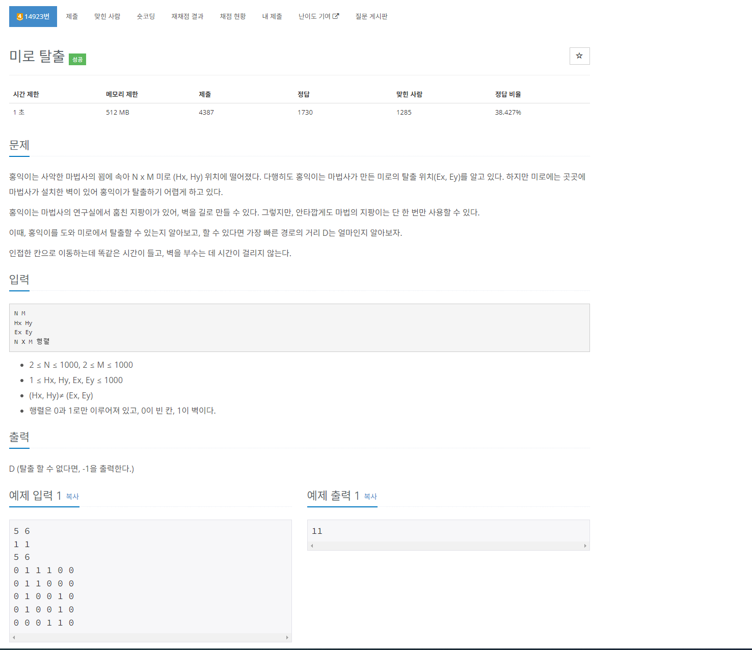 홍익이는 사악한 마법사의 꾐에 속아 N x M 미로 (Hx, Hy) 위치에 떨어졌다. 다행히도 홍익이는 마법사가 만든 미로의 탈출 위치(Ex, Ey)를 알고 있다. 하지만 미로에는 곳곳에 마법사가 설치한 벽이