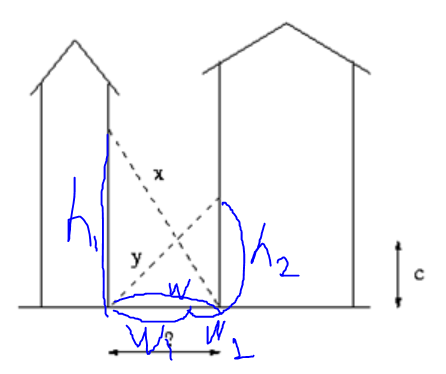 $w_{1} : c = w: h_{2}$와 $w_{2}:c = w: h_{1}$임을 이용해서 c의 값을 $h_{1}$과 $h_{2}$의 값으로 나타낼 수 있다.