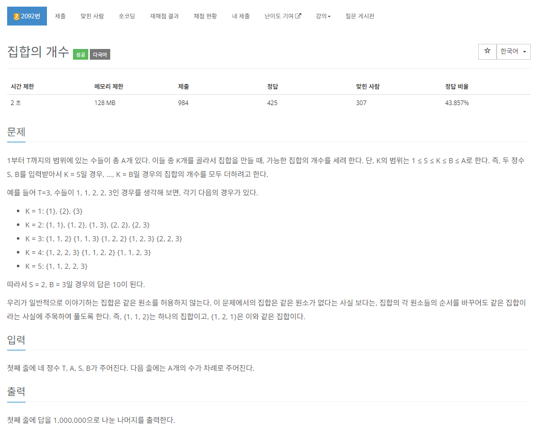 - i가 k개 있을 때 숫자 i까지 집합안에 넣을 개수가 j개가 있다고 하자 j>=k 일때 dp[i][j] += dp[i-1][j-k]이다.