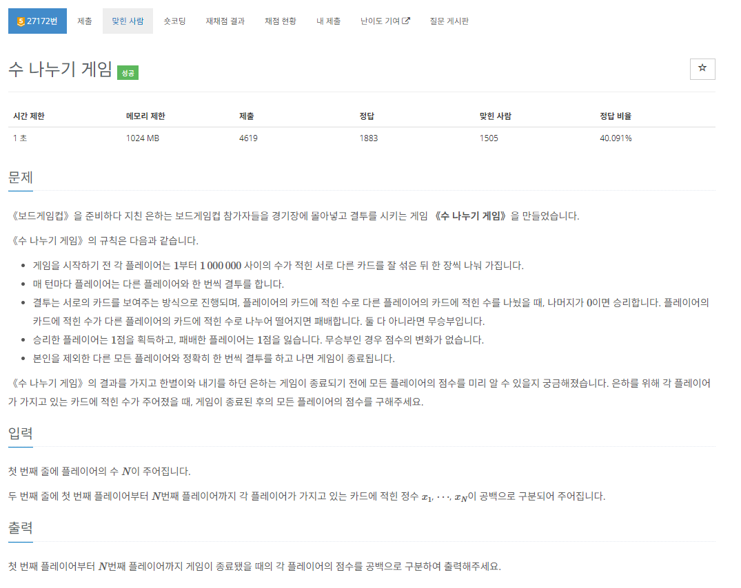 《보드게임컵》을 준비하다 지친 은하는 보드게임컵 참가자들을 경기장에 몰아넣고 결투를 시키는 게임 《수 나누기 게임》을 만들었습니다. 《수 나누기 게임》의 규칙은 다음과 같습니다.