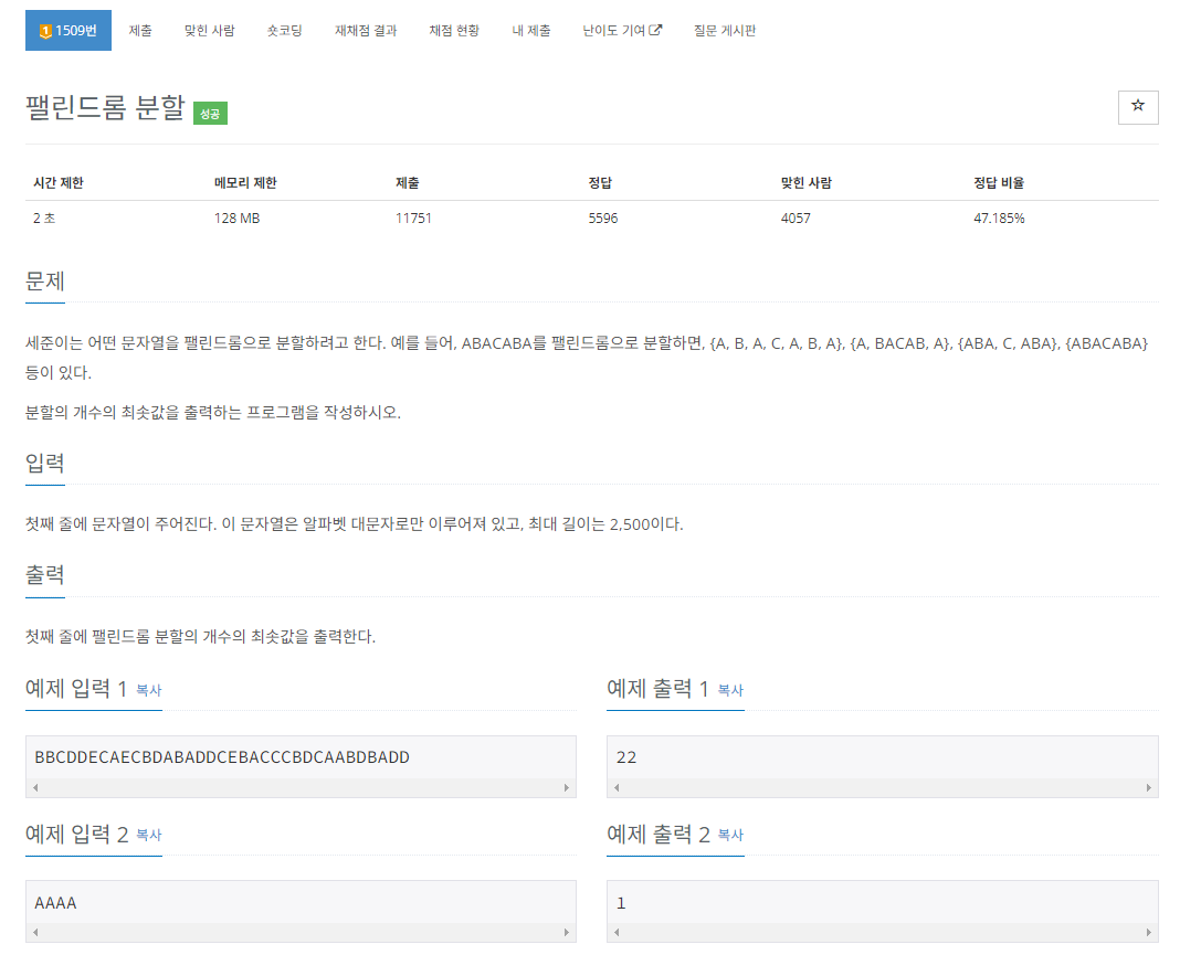 세준이는 어떤 문자열을 팰린드롬으로 분할하려고 한다. 예를 들어, ABACABA를 팰린드롬으로 분할하면, {A, B, A, C, A, B, A}, {A, BACAB, A}, {ABA, C, ABA}, {ABACABA}등이 있다. 분할의 개수의 최솟값을 출력하