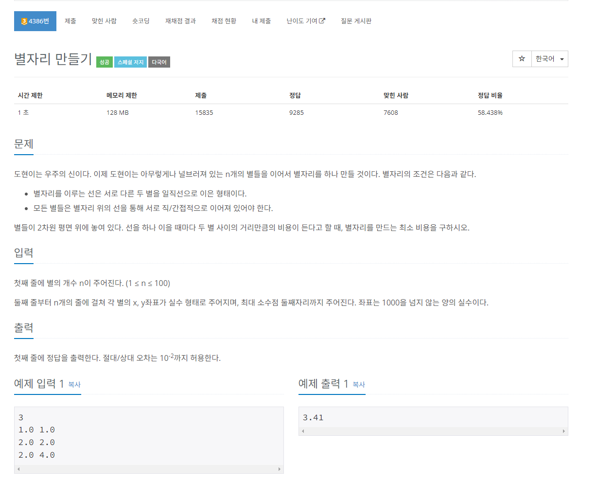 - 단 리스트 안에 두 별자리 간의 거리를 오름차순으로 정렬하고 연결 되어있는지 아닌지 유니온 파인드를 통해 확인하고 해결한다.