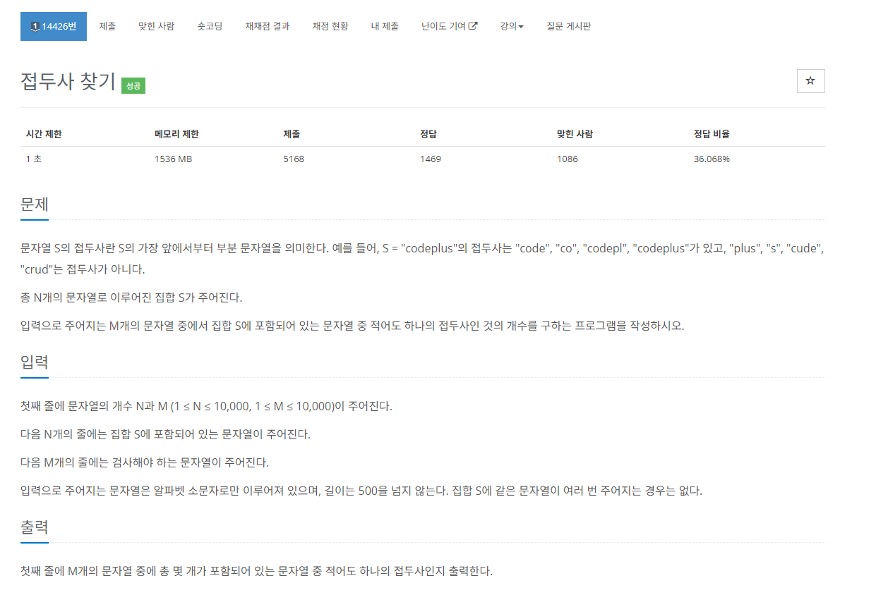 문자열 S의 접두사란 S의 가장 앞에서부터 부분 문자열을 의미한다. 예를 들어, S = "codeplus"의 접두사는 "code", "co", "codepl", "codeplus"가 있고, "plus", "s", "cude", "crud"는 접두사가 아니다. 총 N개의 문자