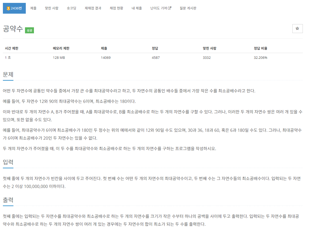 첫째 줄에 두 개의 자연수가 빈칸을 사이에 두고 주어진다. 첫 번째 수는 어떤 두 개의 자연수의 최대공약수이고, 두 번째 수는 그 자연수들의 최소공배수이다. 입력되는 두 자연수는 2 이상 100,0