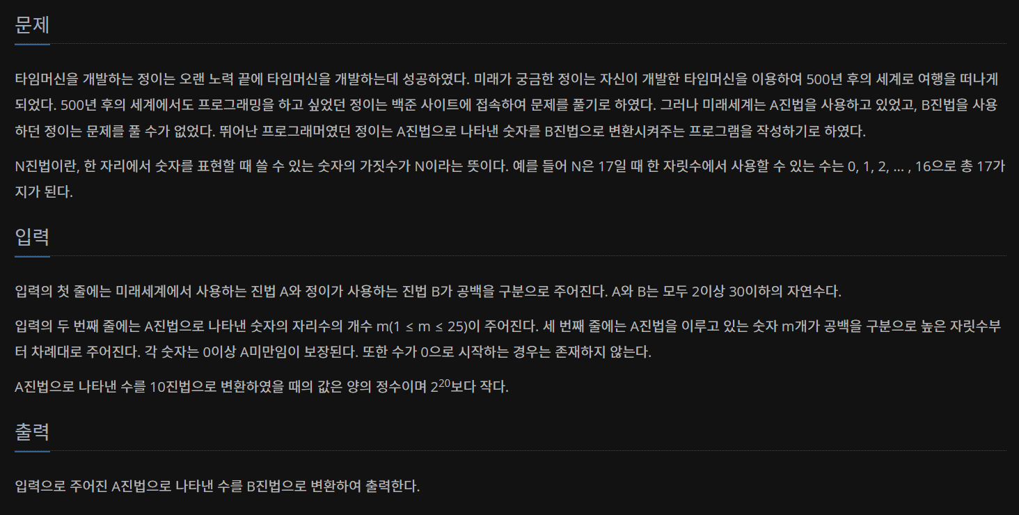 - A 진법을 10진법으로 바꾸고 B진법으로 바꿔야하는가? => 있을 것 같은데 생각이 안나서 10진법으로 바꾸고 다시 B진법으로 바꿈