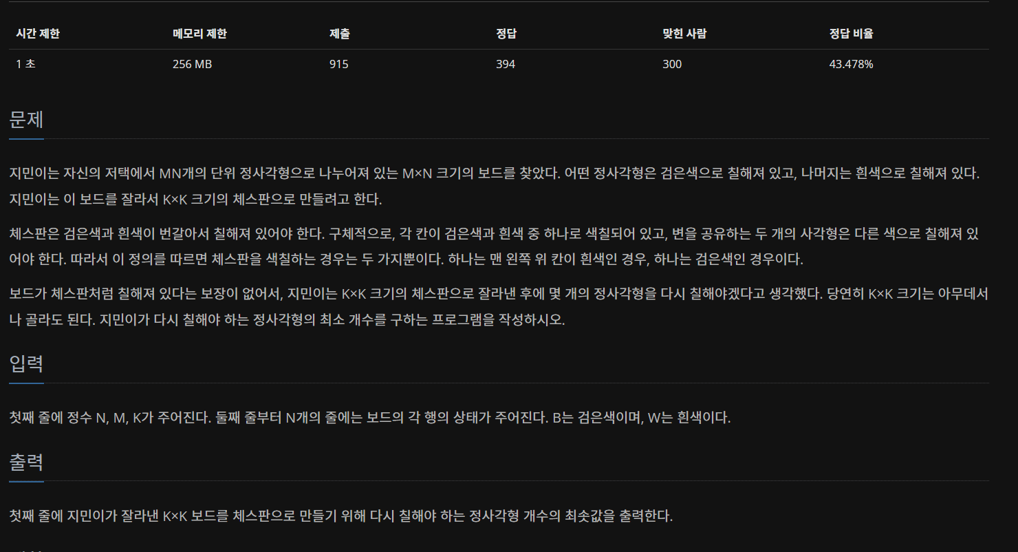 결국 중복적으로 일하게 되는 $m \times n$ 행렬에서 $ (i,i+k-1) \times (j, j+k-1) $ 부분행렬의 원소가 각각 "B" 인지 "W"인지 조사하는 것을 줄여야 할 것이다.