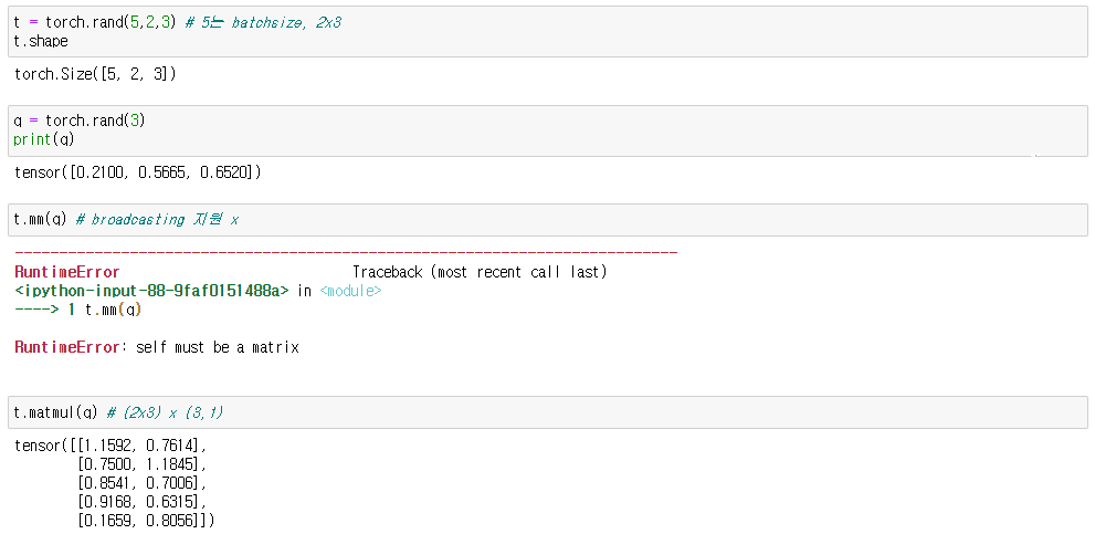 mm과 matmul의 차이점은 mm은 broadcasting을 지원 안한다는 것이고 matmul은 broadingcasting을 지원한다는 것이다.
