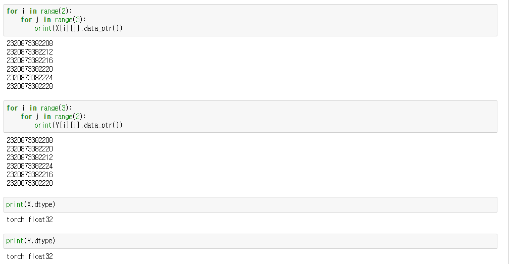 X, Y 모두 torch.float32 자료형은 4바이트이므로, 메모리 1칸 당 주소 값이 4씩 증가한다.