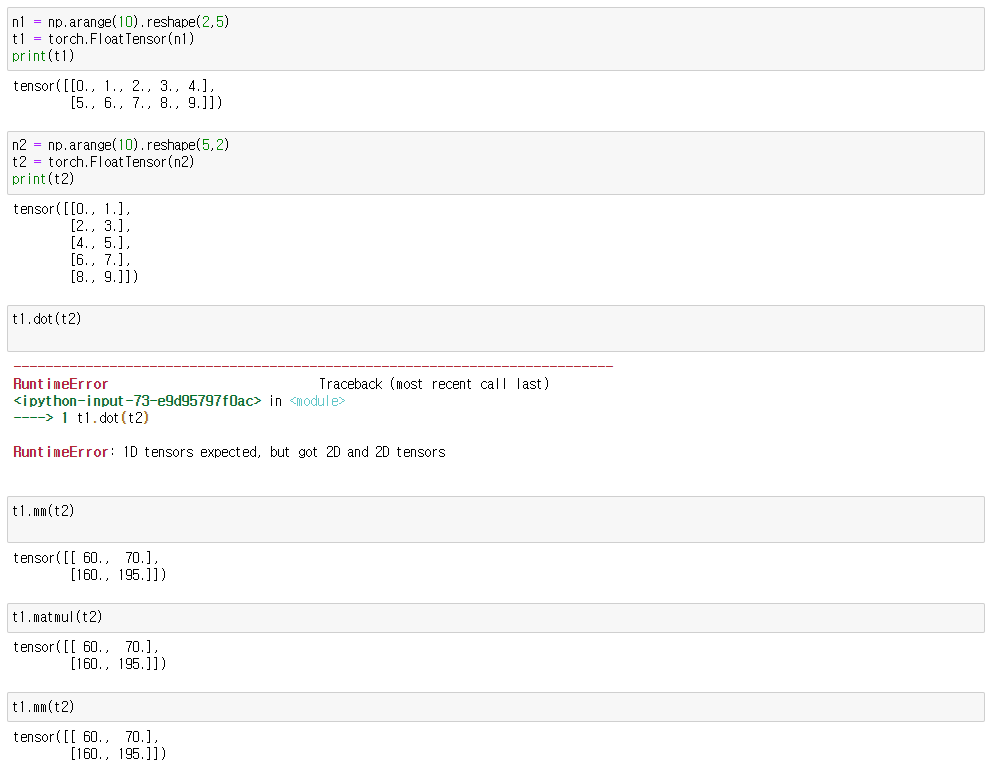 dot와 mm과 matmul을 계산해보면 dot는 곱셈연산을 사용할 수 없다.