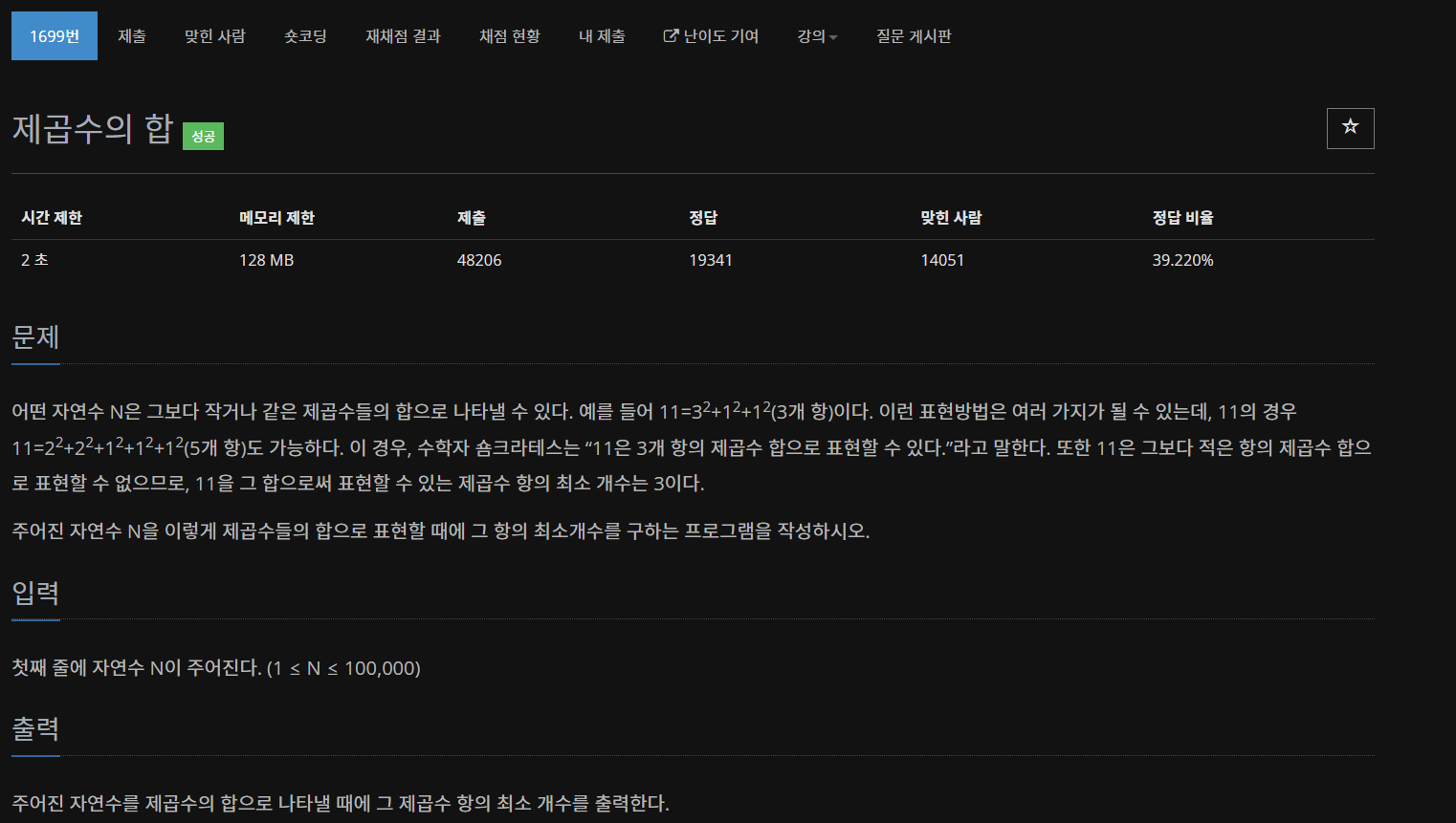 dp[i] = dp[i-j*j] +1 # 참고로 문제 해결 전에는 미리 i=j*2 이면 dp[i]=1로