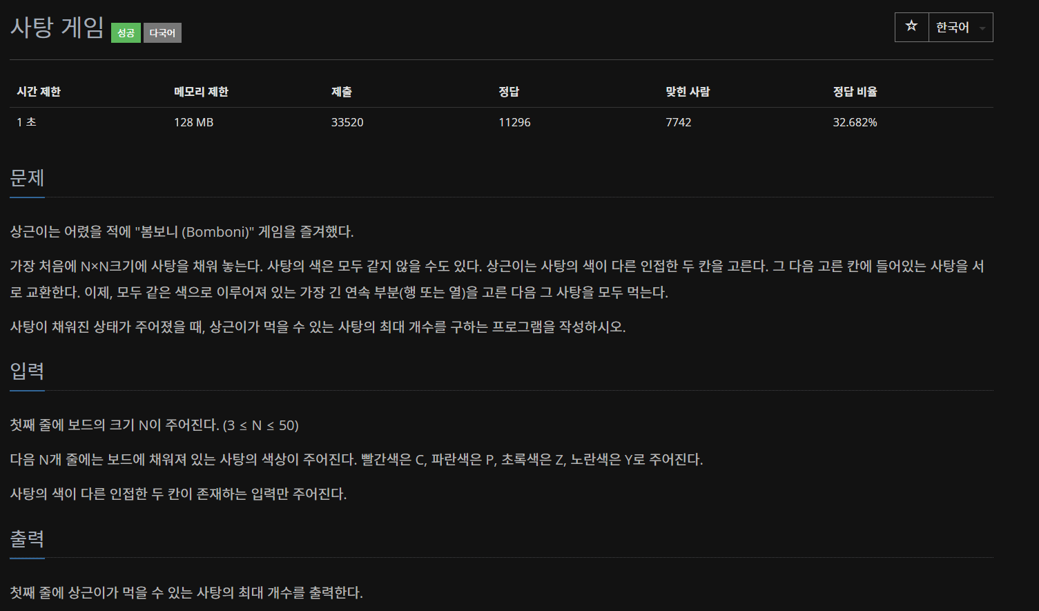 행별로, 열별로 각각 옆에 있는 사탕의 색깔이 다르다는 조건하에 서로 바꾼다음 같은 색으로 이어진 가장 긴 행 또는 가장 긴 열을 찾는다. 찾은다음 다시 사탕의 위치를 원위치 시킨다.