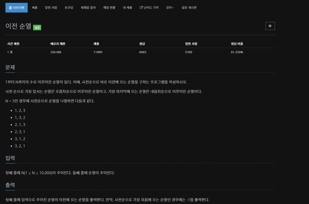 https://www.acmicpc.net/problem/10972 10972번: 다음 순열 첫째 줄에 입력으로 주어진 순열의 다음에 오는 순열을 출력한다. 만약, 사전순으로 마지막에 오는 순열인 경우에는 -1을 출력한다. www.acmicpc.net 문