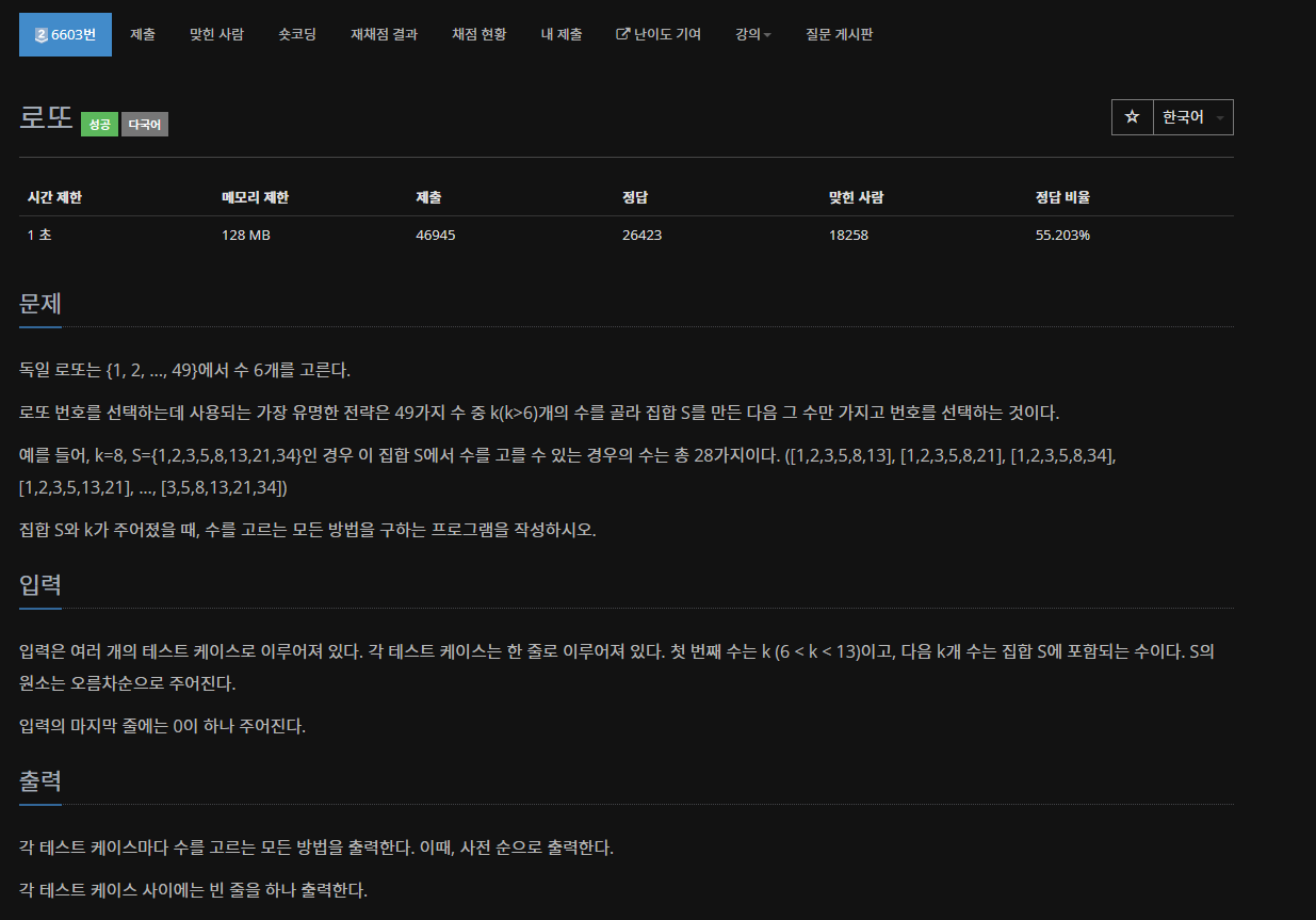입력은 여러 개의 테스트 케이스로 이루어져 있다. 각 테스트 케이스는 한 줄로 이루어져 있다. 첫 번째 수는 k (6 < k < 13)이고, 다음 k개 수는 집합 S에 포함되는 수이다. S의 원소는 오름차순으로
